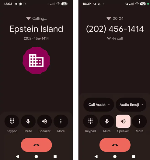 《华盛顿邮报》报道称,该媒体记者26日使用Pixel手机致电白宫时,手机屏幕上显示“爱泼斯坦岛”字样(左图),27日致电时没有出现这种情况(右图)。图源:《华盛顿邮报》报道配图